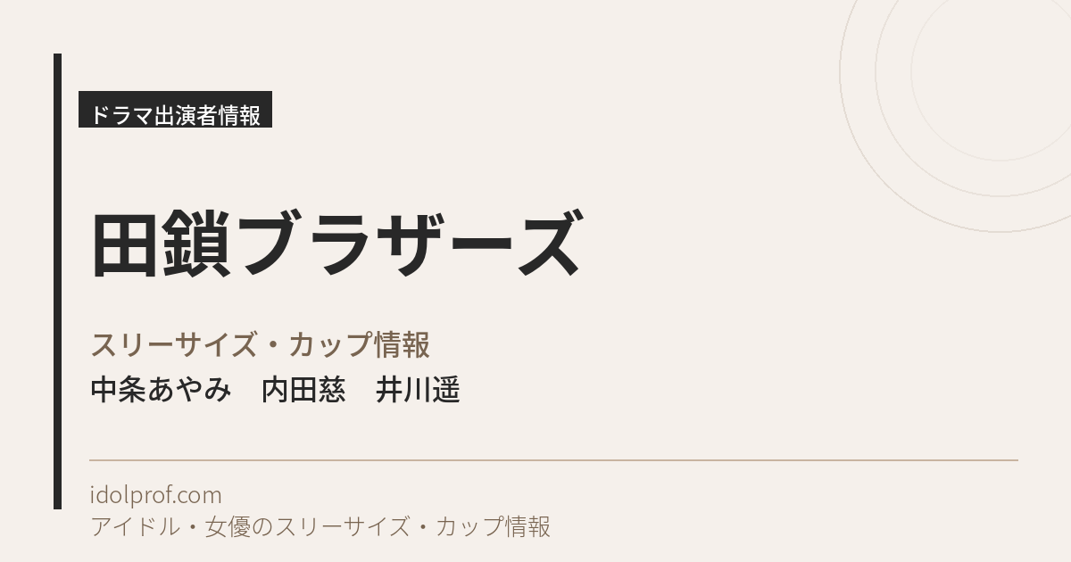 田鎖ブラザーズ ドラマ 2026.04.17 田鎖ブラザーズ 出演者情報(スリーサイズ、カップ情報) ※年齢はドラマ放送時の年齢 役名 名前 年齢 身長 体重 B W H カップ 宮藤詩織 中条あやみ 29 171 78 56 82 青委警察署刑事課強行犯係・巡査部長。現場の最前線で事件に立ち向かう凛々しく芯のある刑事。 桐谷千佳 内田慈 43 162 84 60 89 神奈川県警捜査一課検視官室の検視官補助・警部補。稔と共に行動し、検視の補助をしている。 足利晴子 井川遥 49 167 85 59 87 質屋の店主で、情報屋。